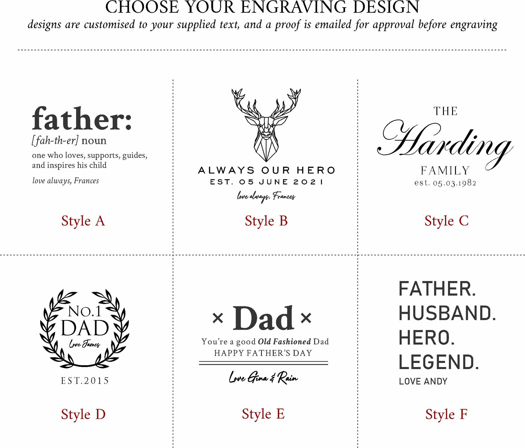 Please select which engraving style you prefer, and include your details in the Engraving Details section. A proof will be sent once the order is received.