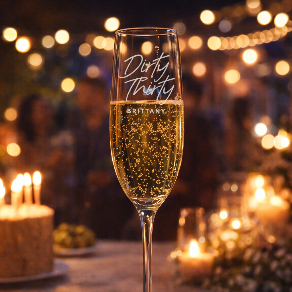 Champagne glass with Dirty Thirty Birthday design, in an outdoor setting with string lights in the background