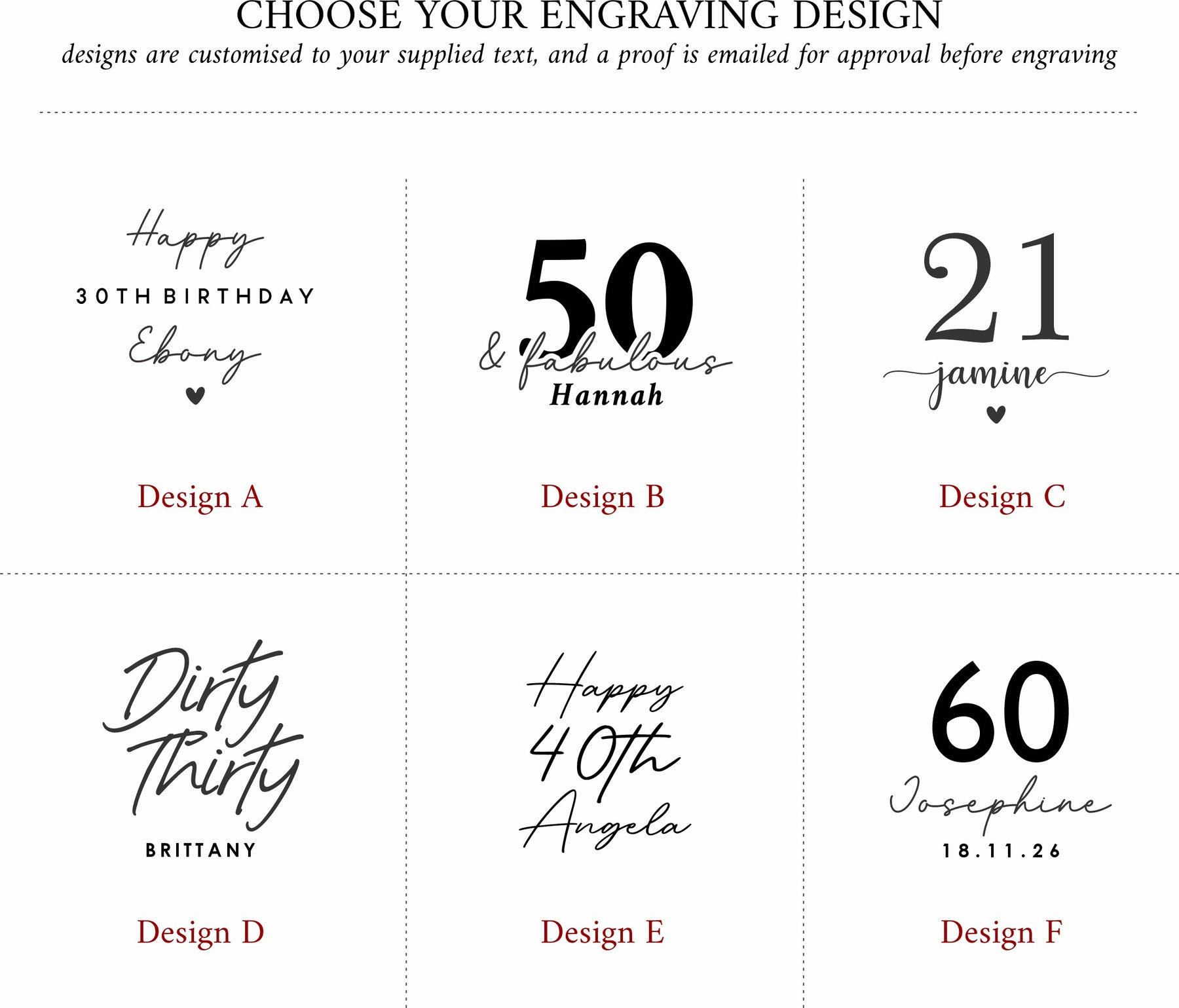 Please select which engraving style you prefer, and include your details in the Engraving Details section. A proof will be sent once the order is received.