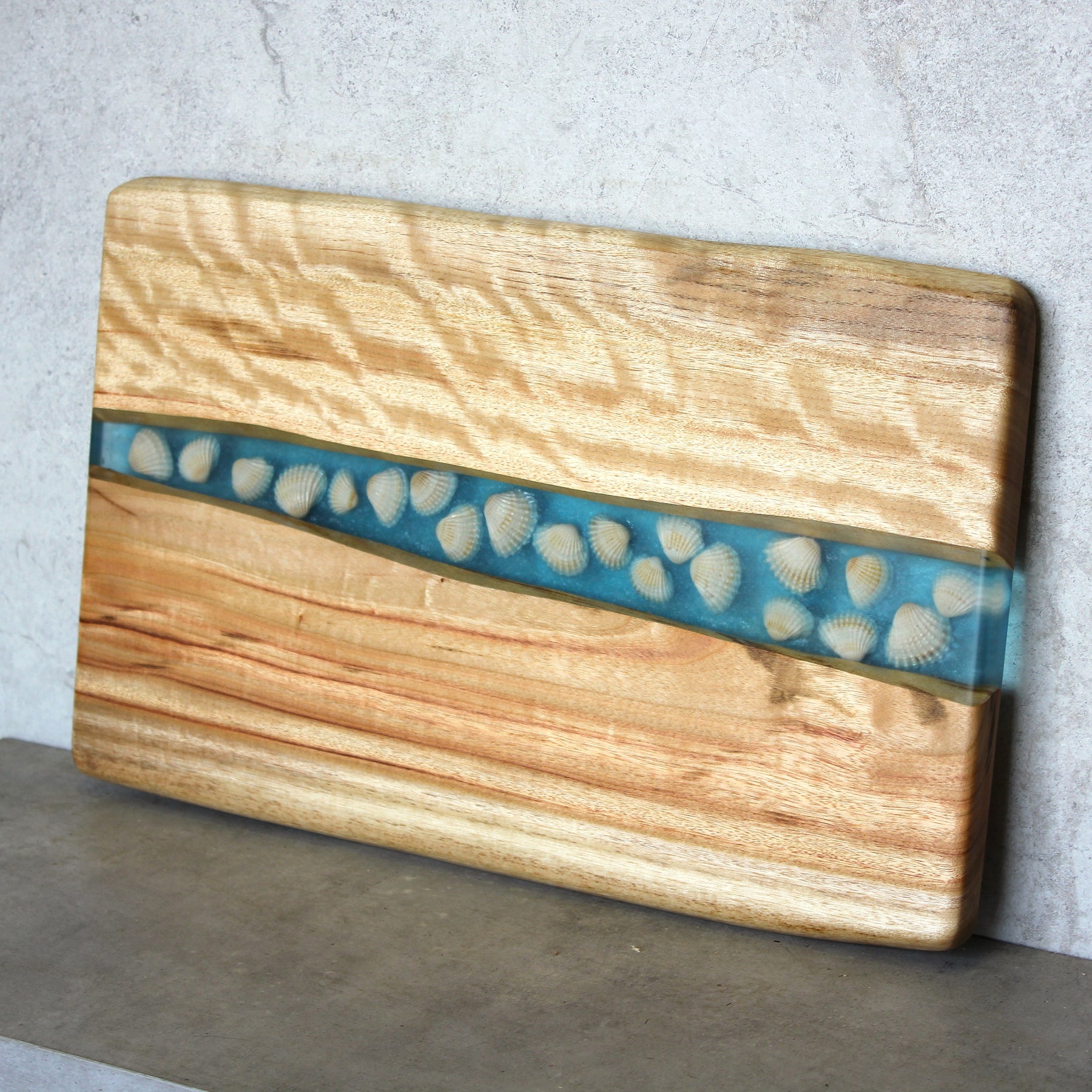 Exceptionally unique board with blue base, white shells and clear epoxy on top. Lovely timber grain as well. Such a pretty piece for someone who loves the beach!